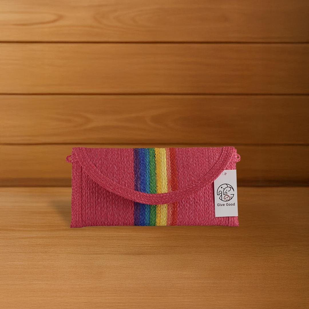 This 10-inch clutch is crafted from natural sansevieria fiber, featuring vibrant rainbow stripes on a natural base. Designed with a curved flap and magnetic or snap closure, it’s ideal for daily essentials like cash, phone, or personal items — perfect for everyday use or special occasions.