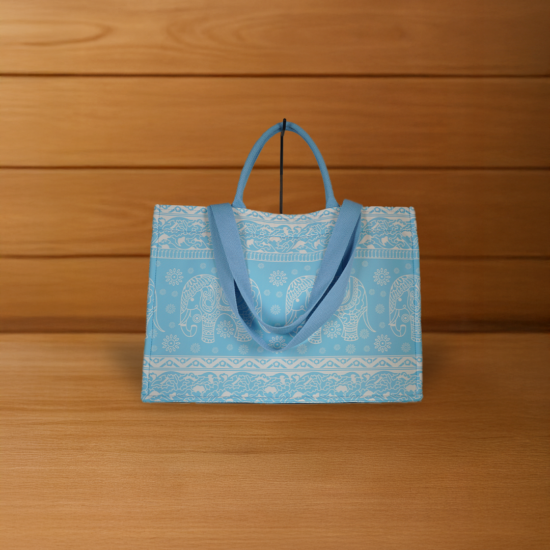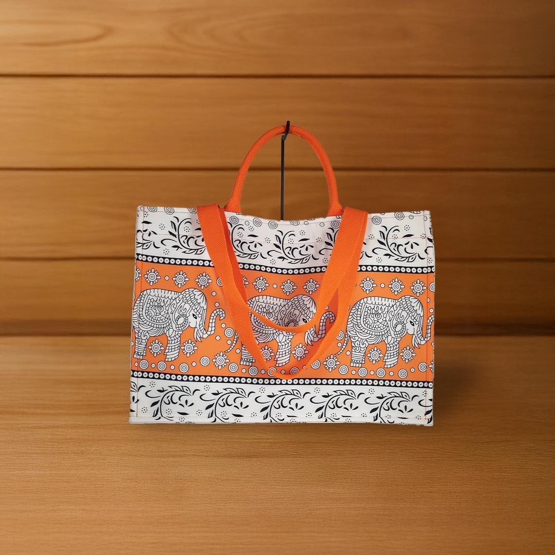This large rectangular canvas bag features a vibrant seven-shade rainbow Maru-style elephant print, blending modern flair with traditional charm. Crafted from premium durable canvas, it comes with sturdy red fabric handles for easy carrying. Perfect for shopping, travel, or everyday use, this bag combines vivid style with practical strength for all your daily essentials.