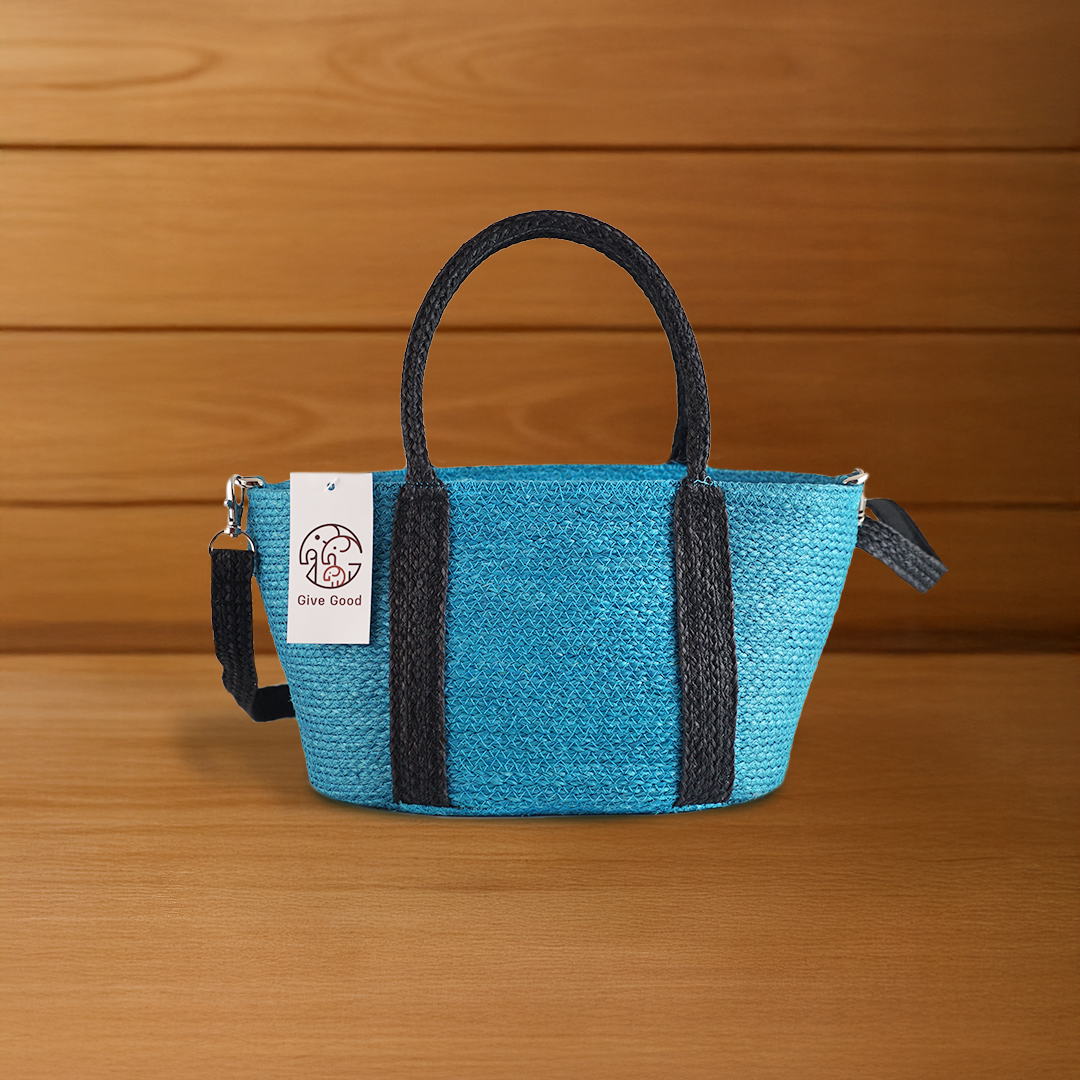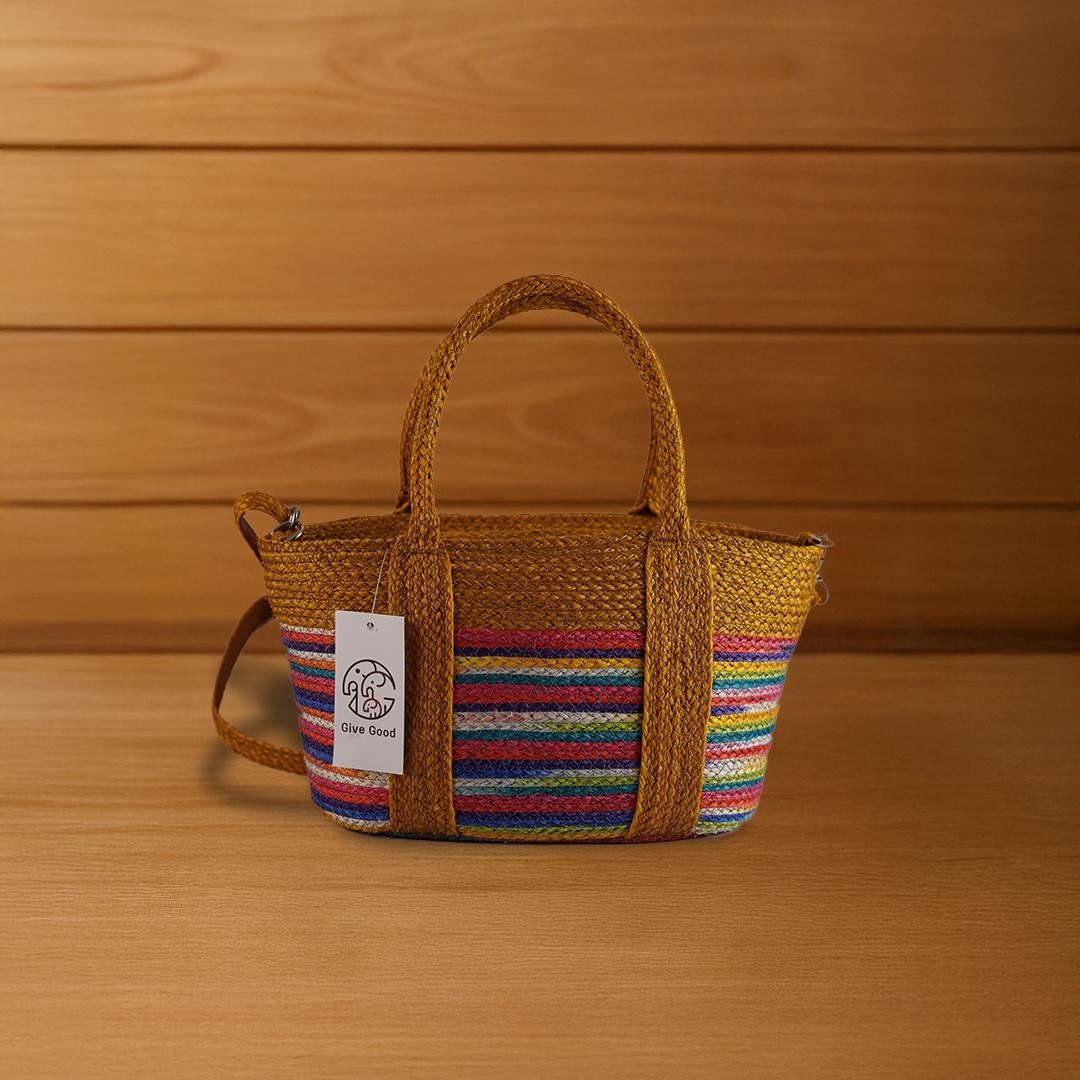 The ESP Front-Strap Bag is handwoven from natural Sansevieria fiber, featuring a vibrant fabric panel across the front that adds a lively, modern touch. With its large rectangular shape and sturdy handles, it’s perfect for daily essentials or short trips. A stylish and functional piece for those who value unique, handcrafted design.