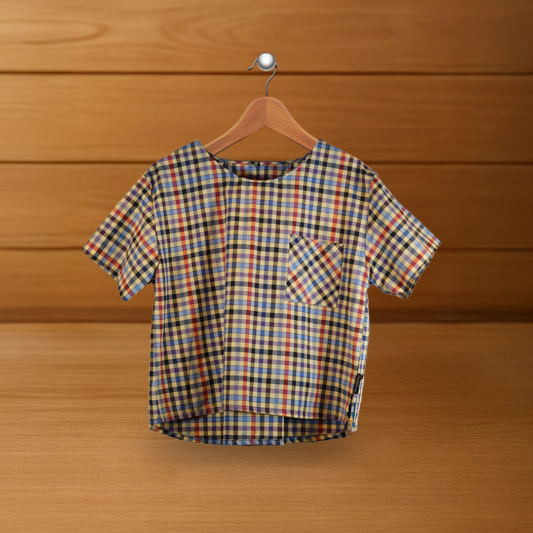 Cassie — A handwoven Pha Khao Ma shirt by Pakama, designed in a modern silhouette with vibrant checkered patterns. Made from premium handwoven cotton, it’s soft, breathable, and perfect for everyday wear. Featuring short sleeves and a small front pocket for added charm and practicality, this piece is ideal for those who appreciate contemporary fashion with a touch of Thai textile heritage.